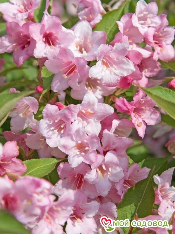 Вейгела Розеа (Weigela florida Rosea) — гибрид между вейгелой цветущей и вейгелой корейской. Раскидистый кустарник до 2м высотой и до 2,5м шириной. Цветки очень крупные с колосовидным отгибом, розовые, слегка пестрят белым, обильно появляются на кусте в июне месяце. Листья светло-зеленого цвета, осенью краснеют. Этот сорт зимует лучше всех других, ему требуется лишь небольшое укрытие листом. Любит солнечные места, плодородные дренированные почвы. Уход за растением: Саженцы вейгелы нужно сажать в плодородную, воздухопроницаемую почву. Сразу учитывайте, что место постоянное, так как пересадить массивный куст с пышной кроной даже при желании будет практически невозможно. Для того, чтобы растение выглядело аккуратно, его нужно стричь, удаляя больные и поврежденные ветки и формируя крону так, как вам это нужно. В первый сезон кустарник нуждается в регулярном поливе, затем вейгелу поливают только при длительных засухах.